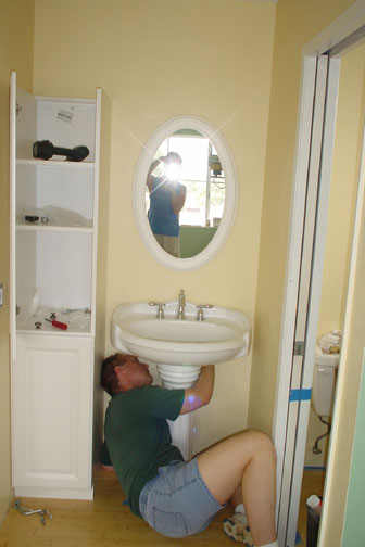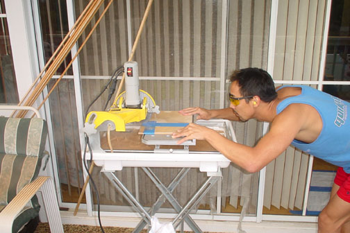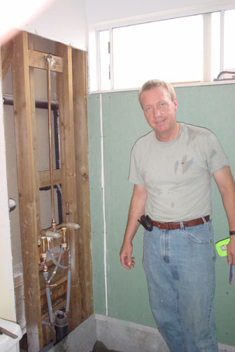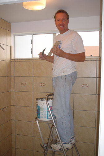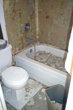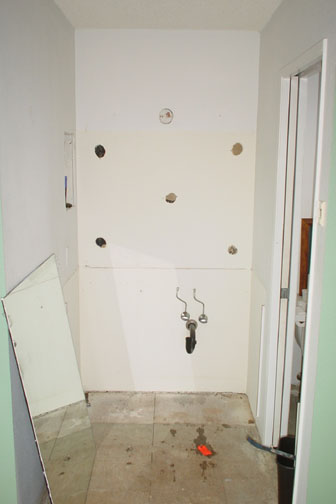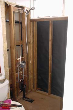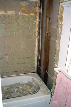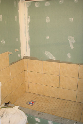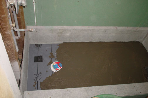 the old tile, wall board and tub was lots of fun! first goes in the new liner then the mortar bed to slope the floor to the